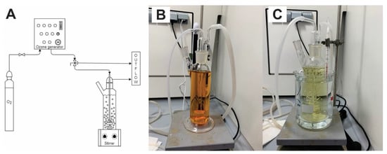 Laboratory set-up of oxidation experiments: (A) scheme of experimental set-up, (B) catalytic ozonation (O3/Fe2+) at t = 0 min, (C) catalytic ozonation (O3/Fe2+) at t = 120 min.
