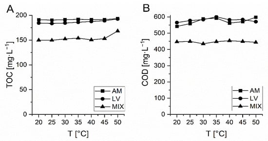 In Figure 3 TOC and COD during thermal stability testing of AM, LV and MIX (AM+LV+VM) are presented. In the investigated temperature range (20–50 °C) COD and TOC of the solutions did not change significantly (± 4%) and thus it was confirmed that measured changes of both parameters are due to the oxidative treatment and not related to the temperature changes.
