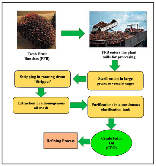 The refining of palm oil improves the production of palm oil and its quality. It is a process to extract oil from crude palm oil (CPO) into an edible form. Before the refining process is conducted, CPO needs to be extracted from palm oil fruits. Figure 1 illustrates the production stages for CPO.