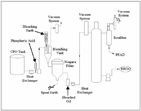 The physical refining of palm oil consists of two stages, namely, pretreatment and deodorization. Pretreatment involves degumming and bleaching processes. The aim of the process is to remove undesirable impurities. This aim is achieved when chemical compounds, phosphoric acid and bleaching earth are added in the process. These compounds are used to adsorb the unwanted impurities whereby the color, flavor, and shelf-life stability of the finished product are monitored and controlled [12]. Furthermore, high temperatures are needed to remove free fatty acids (FFA) from CPO during steam distillation in the deodorization process [4]. The schematic diagram of the process is illustrated in Figure 4. The degumming, bleaching, and deodorization processes are described in detail in the following subsections.