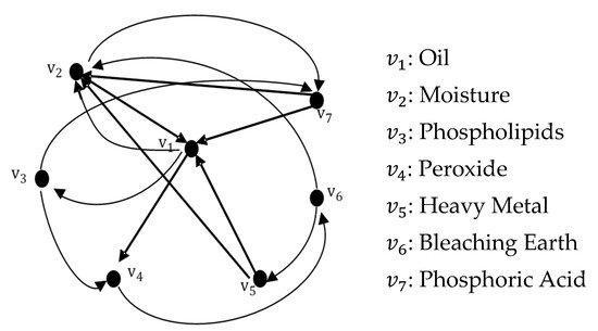 The refining process of palm oil consists of seven variables as vertices as described in Section 6 earlier. Figure 8 illustrates the graphical representation of the refining process of palm oil . The edges are defined as connection such that a vertex catalyzes another vertex.