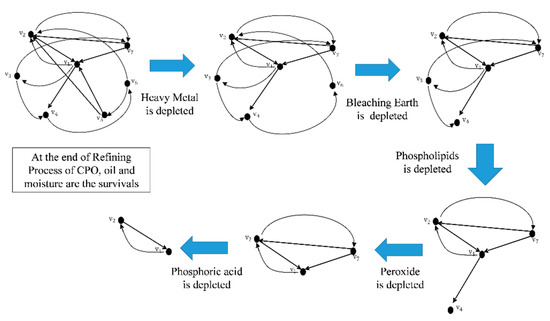 The dynamicity of graph is summarized in Table 6 of Section 7 whereby heavy metals are the first variable depleted in the refining process. The sequence of depleted compounds begins with bleaching earth, phospholipids, peroxide, and finally phosphoric acid. The remaining compounds at a given time, t, are summarized as follow (see Table 7):
