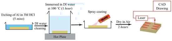 We used Aluminium-6061 alloy of size 40 mm × 40 mm × 3 mm as substrate. Figure 1 summarizes the fabrication steps of wettability patterns proposed in this work. The polished substrate was ultrasonically cleaned in a mixture of ethanol, acetone and DI water at room temperature and dried by blowing nitrogen gas. The ultrasonically cleaned sample was then microtextured by chemical etching using 3 M hydrochloric acid for 5 min and further cleaned in a DI water bath. After that, nanotexturing of the microtextured aluminium sample was performed by immersing in DI water at a temperature of 100 °C for 1 h. A hierarchical surface morphology consisting of micro/nanostructures was obtained by using these steps and the contact angle of the surface reached nearly zero. Next, the sample was spray-coated with commercial Glaco solution (colloidal solution of SiO2 nanoparticles in isopropanol solution) and dried in room temperature for around 2 h to achieve superhydrophobicity. Then the final wettability patterns were obtained using a 60 W CO2 laser engraver (VLS 3.60, Universal Lasers) with a spot size of 30 μm. We used 90% of power and 5% of laser speed during laser ablation. The laser-ablated areas were transformed to superhydrophilic after the laser ablation and the unexposed area remained as superhydrophobic.