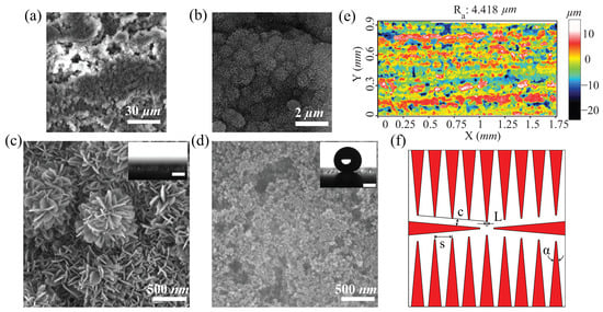 SEM images of modified surface at different resolutions (a–c) after micro/nano texturing (d) after Glaco coating (superhydrophobic) (e) profilometer micrograph of Glaco coated surface (f) CAD drawing of the proposed design L = 0.35 mm, c = 2 mm, s = 5 mm, = 10°. Red shading represents the laser ablated region. The insets in (c,d) shows the contact angle of the modified surface (it is zero on laser ablated area, before Glaco application). Scale bar in contact angle snapshot is 1 mm.