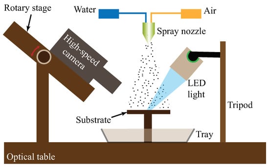 Schematic illustration of the experimental setup for spray impact test. The air pressure at inlet of the spray nozzle was 2 bar and DI water flow rate was 0.5 mL/s.