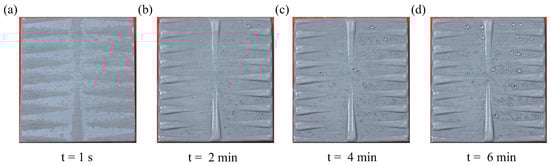 We performed continuous spray impact on the surface for 6 min from a height of 125 mm, at a pressure of P = 2 bar, with flow rate 0.5 mL/s. The drop size and velocity measurements were obtained at the same distance from the nozzle exit. The resulting droplet size varied from 0.1 μm to 115.6 μm and the number-based mean diameter was 12 μm. The droplet axial velocity varied from −1.65 m/s to 46.64 m/s and the mean axial velocity was 16.75 m/s. The droplet size and the axial velocity distribution of the poly-dispersed spray is presented in Figure A1 (see Appendix B). Figure 4a shows that at s the droplet on the superhydrophilic wedge forms a thin liquid film whereas the droplets on the superhydrophobic regions remains as a droplet. At min, the formation of liquid film on the wedges is complete (with its characteristic bulge shape) and becomes stable, the liquid drains out continuously through the wider section of the wedge. The snapshots at min, min and 6 min (Figure 4b–d) show that the liquid volume on the surface remains identical, indicating that the liquid on the surface is being continuously replaced. This continuous replacement of liquid from the surface has advantages in spray cooling.