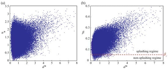 (a) Spray characteristics in terms of non-dimensionless velocity () and non-dimensionless diameter () (b) Representation of the impacted poly-dispersed droplets on the superhydrophobic surface in the splashing and non-splashing regimes.
