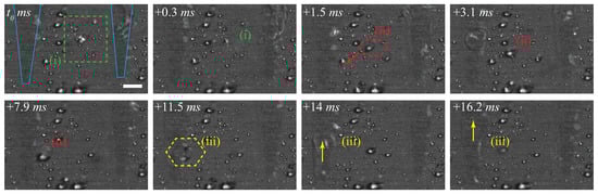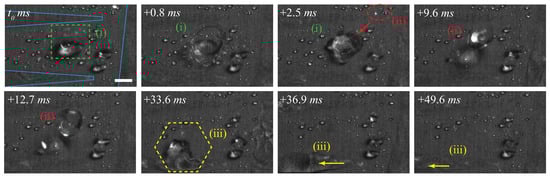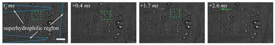 Figure 7 shows the droplet transport mechanism from the superhydrophobic region to the superhydrophilic region due to the interaction of a falling droplet with stationary droplets present on the superhydrophobic region (Video S2). When a droplet fell on a stationary droplet, they coalesced and splashed. After the splashing, the droplet rebounded and lifted-off from the surface (see the event (i) in Figure 7). This lifting of the coalesced droplet is due to the conversion of excess surface energy gained from the coalescence to kinetic energy [9,35]. The lifting droplet may come in the path of a flying droplet and merge, as shown in the event (ii) of Figure 7. The lifting droplet fell again on the superhydrophobic region or in the liquid pool due to gravity. The event (ii) in Figure 7 shows that when the lifting droplet fell near the wedge border, it coalesced with the liquid pool. The event (iii) in Figure 7 shows that the accumulated volume of liquid on the wedge forms a bulge shape and the liquid moves towards the wider section of the wedge due to the Laplace pressure difference. The yellow arrow in Figure 7 shows the direction of the bulge motion on the wedge.