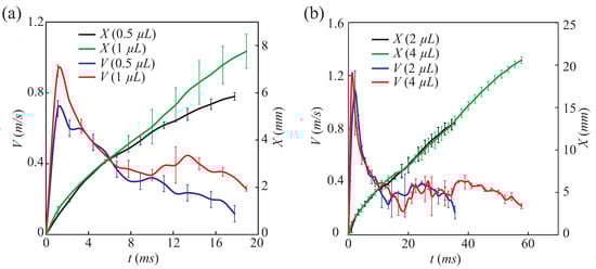 Temporal variation of droplet transport velocity (V) and droplet front position (X) on a wedge track for different droplet volumes (a) 0.5 μL, 1 μL (b) 2 μL, 4 μL.