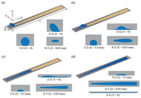 Liquid motion on a wedge track laid on a superhydrophobic surface of length mm and width mm. (a–d) corresponds the isometric view and cross sectional views of the liquid at time s, s, s and 2 s respectively. Initial liquid deposition point is taken as the reference point (X, Y, Z) = (0, 0, 0).