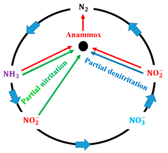 Currently, novel technologies of nitrogen removal have been intensively investigated in order to implement solutions for energy consumption savings and to lower carbon demand, which is based on partial nitritation (PN) and partial denitritation (PDN). These approaches could be combined with the anammox-based process as shown in Figure 1.