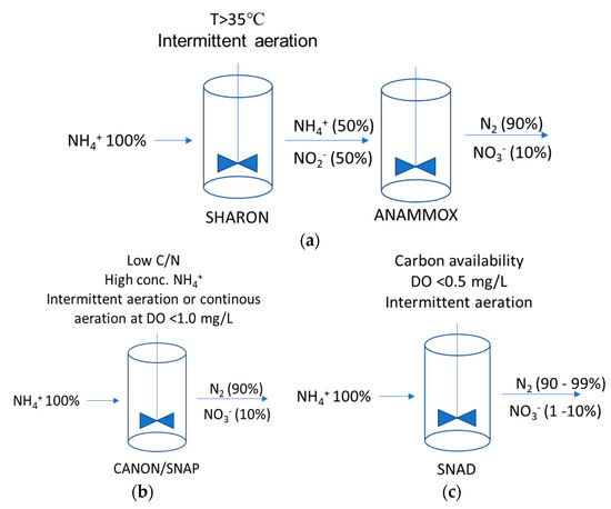 An overview of technologies based on the deammonification process: single reactor for high activity ammonium removal over nitrite (SHARON) (a) completely autotrophic nitrogen removal over nitrite CANON/ (single-stage nitrogen removal using anammox and partial nitritation SNAP (b) simultaneous partial nitrification, anammox, and denitrification SNAD (c).