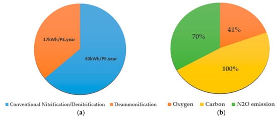 The role of deammonification vs. conventional nitrification/denitrification process on the decrease of overall amount of energy consumption (a) and oxygen consumption, nitrous oxide, and carbon from Wastewater Treatment Plant WWTP (b) based on [110,111].