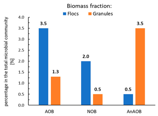 Based on the processes kinetics performed by AOB and NOB, the minimal AOB/NOB ratio of their abundance in the biomass, in order to maintain the stability of the deammonification process, is considered around 2:1 [22]. In addition, activity of the nitrifying autotrophic bacteria and dynamics of their population can be affected by applied reactor type, for instance, application of the moving bed biofilm reactor (MBBR) enables to maintain the stable deammonification process under low-temperature conditions [23].
