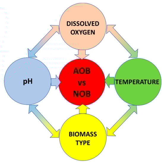Temperature, DO, and pH are key parameters in wastewater treatment and their impact on the bacterial metabolism has been the subject of intensive research in recent years (Table 3). Such major operating factors can directly affect AOB, NOB, and AnAOB activity, as well indirectly influence other parameters e.g., free ammonia (FA) and free nitrous acid (FNA), indicating the importance of interaction among these factors to inhibit NOB activity through the shortcut nitrification process (Figure 3). Therefore, the following discussions focus briefly on the effects of the main operating factors on shortcut nitrification process efficiency and activity of the particular bacterial groups involved in nitrogen metabolism.