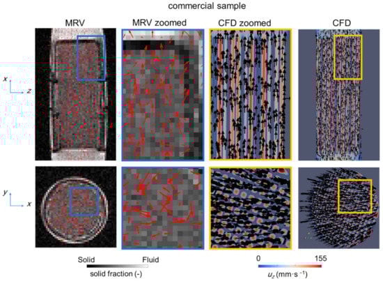 - Sadeghi, M.; Mirdrikvand, M.; Pesch, G.R.; Dreher, W.; Thöming, J. Full-field analysis of gas flow within open-cell foams: Comparison of micro-computed tomography-based CFD simulations with experimental magnetic resonance flow mapping data. Exp. Fluids 2020, 61, 1–16. [Google Scholar] [CrossRef]