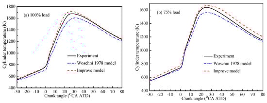 The comparison of a cylinder temperature of a diesel engine fueled with biodiesel is shown in Figure 7. It can be observed that the in-cylinder temperature significantly increases with the increase in engine load and speed. This is due to the increased fuel mass. In addition, it can be observed that the improved model can predict the cylinder temperature of diesel engines under 100% load (see Figure 7a), 75% load (see Figure 7b) and 50% load (see Figure 7c) compared to the predictive results with the experimental results. However, the improved model is more accurate. More specifically, the max. cylinder temperature predicted by the improved model is 1728 K, 1657 K and 1587 K, respectively. The corresponding errors of the improved model are 2.9%, 2.3% and 3.1% compare with the measurement value. In addition, the max. cylinder temperature predicted by the original model is 1618 K, 1548 K and 1576 K, respectively. The corresponding errors of the improved model are 3.6%, 3.5% and 3.0% compare with the measurement value. When the nucleate boiling and swirl occurs at the surface, the heat transfer in the cylinder can be calculated accurately by using the improved model. Based on the analysis above, the improved model can accurately predict the cylinder temperature of diesel engines under different conditions.