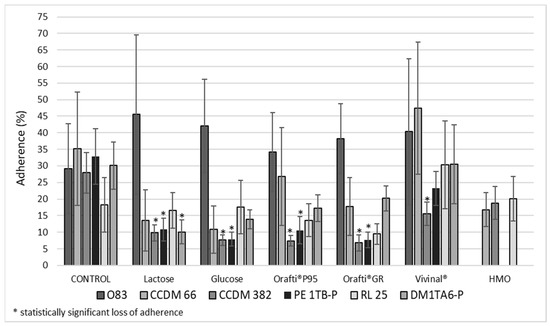 Notably, prebiotics also enhanced adherence in E. coli O83, although this increase was not statistically significant. Adherence in this strain was not tested in the presence of HMOs. In contrast, significant loss of adherence was observed in B. dentium CCDM 318, which was isolated from dental caries, in the presence of all prebiotics, sugars, and HMOs. Similar trends were observed in Bifidobacterium breve CCDM 562, Lactobacillus animalis CCDM 382, B. animalis subsp. lactis Bb12, and Lactobacillus casei subsp. paracasei PE1TB-P.