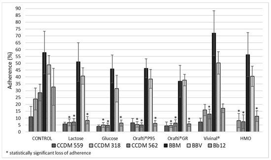 Adherence of bifidobacteria (CCDM 559, CCDM 318, CCDM 562, BBM, BBV and Bb12) in the presence of prebiotics.