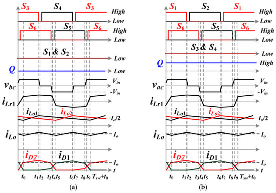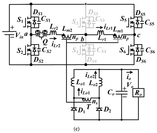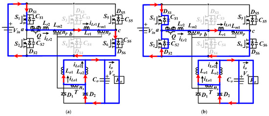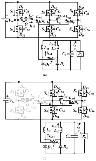 In relation to the ON/OFF status of Q and S1–S6, two equivalent sub-circuits shown in Figure 1 are operated to have a wide voltage input operation and a ZVS turn-on operation. According to the voltage-second balance on Lo1 or Lo2, the load voltage Vo can be expressed as Equation (14):