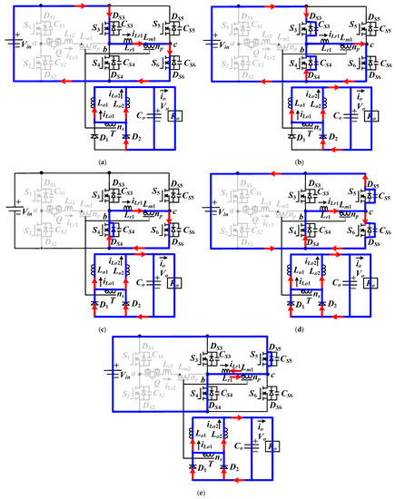 According to the PWM waveforms of S3–S6 and the conducting states of D1 and D2, ten operating steps can be observed in Figure 2a under the low voltage input case. As can be observed, the PWM waveforms are symmetric for each half cycle. Thus, only the first five operating steps are explained briefly, and the corresponding step circuits are given in Figure 3.