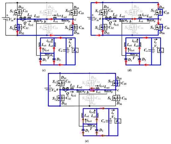 For high voltage input operation (2.3Vin,min ≤ Vin,H < 5Vin,min), ac switch Q is ON and active devices S4 and S3 are OFF. Then, the full-bridge converter with switches S1, S2, S5, and S6, as shown in Figure 1c, is operated with duty cycle control. The transformer turns ratio on this equivalent circuit becomes NH = 2np/ns. The dc gain can be expressed as Vo/Vin,H ≈ deff/NH. This can be observed in Figure 2b. The converter has five steps in one-half of the switching period. The corresponding step circuits are given in Figure 4, and the circuit operations are explained briefly in the following discussions.