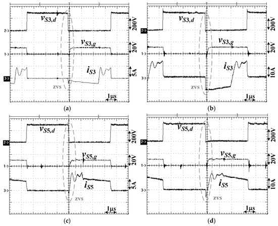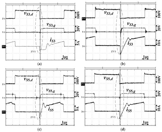 Test waveforms of S3 and S5 at Vin = 290 V (low voltage input range): (a) S3 under 20% load; (b) S3 under 100% load; (c) S5 under 20% load; (d) S5 under 100% load.