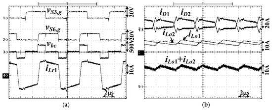 Test waveforms at Vin = 290 V (low voltage input range) and Po = 800 W: (a) primary-side waveforms vS3,g, vS5,g, vbc, and iLr1; (b) secondary-side waveforms iD1, iD2, iLo1, iLo2, and iLo1 + iLo2.