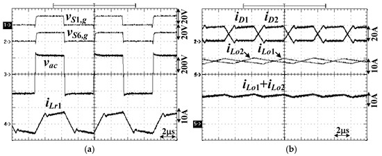 Test waveforms at Vin = 250 V and Po = 800 W: (a) primary-side waveforms vS1,g, vS5,g, vac, and iLr1; (b) secondary-side waveforms iD1, iD2, iLo1, iLo2, and iLo1 + iLo2.