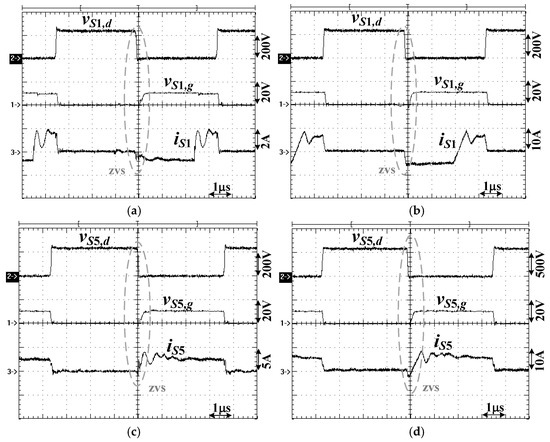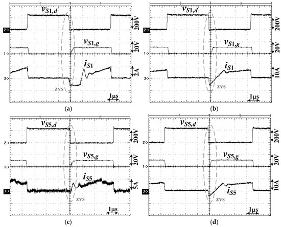 Test waveforms of S1 and S5 at Vin = 600 V: (a) S1 under 20% load; (b) S1 under 100% load; (c) S5 under 20% load; (d) S5 under 100% load.
