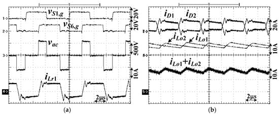 Test waveforms at Vin = 600 V and Po = 800 W: (a) primary-side waveforms vS1,g, vS5,g, vac, and iLr1; (b) secondary-side waveforms iD1, iD2, iLo1, iLo2, and iLo1 + iLo2.