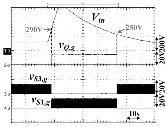 The experimental waveforms of the proposed converter at a low voltage input range (Vin = 120~290 V) are given in Figure 6, Figure 7, Figure 8 and Figure 9. The measured results under a high voltage input range (Vin = 250~600 V) are given in Figure 10, Figure 11, Figure 12 and Figure 13. Figure 6 provides the experimental primary-side (Figure 6a) and secondary-side (Figure 6b) waveforms at Vin = 120 V and Po = 800 W. Note that the duty cycle on voltage vbc is close to 0.5, the ripple current on iLo1 + iLo2 is reduced compared to the ripple current on iLo1 or iLo2, and the resultant current iLo1 + iLo2 has twice the switching frequency of currents iLo1 and iLo2. Figure 7a,b gives the PWM signal of S3 at 20% power and 100% power with the Vin = 120 V input case. In the same way, the PWM waveform of S5 (lagging-leg switch) at 50% and 100% loads are illustrated in Figure 7c,d. Figure 8 and Figure 9 provide the measured results of the presented converter operated at Vin = 290 V in the low voltage input region. Since the higher input voltage will result in a lower duty cycle, it is clear that the voltage vbc at Vin = 290 V input has less duty ratio than in the Vin = 120 V input condition. It can also be noted in Figure 6b and Figure 8b that iLo1 + iLo2 has more ripple current at Vin = 290 V than Vin = 120 V. Figure 9 gives the experimental waveforms of S3 in leading leg and S5 in lagging leg in the 290 V input condition. It can be observed from Figure 7 and Figure 9 that the ZVS turn-on operation of S3 is realized from 20% power for both 120 V and 290 V input conditions. Likewise, the ZVS turn-on operation of S5 is accomplished from 50% power under 120 V and 290 V input cases. For a high voltage input range (Q is ON and S3 and S4 are OFF), the test results are shown in Figure 10, Figure 11, Figure 12 and Figure 13. For Vin = 250 V, the experimental results at 100% power are given in Figure 10. The PWM signals of S1 and S5 are given in Figure 11. In the same way, the experimental waveforms for Vin = 600 V input are given in Figure 12 and Figure 13. From the experimental results in Figure 7, Figure 9, Figure 11 and Figure 13, it can be observed that the leading-leg switch, such as S1 and S3, can achieve ZVS operation from 20% load, and the ZVS operation of S5 in the lagging leg is from 50% power. The measured results of Vin, vQ,g, vS1,g, and vS3,g between 120V and 600 V input are shown in Figure 14. When Vin is increased from 120 V to 290 V, the presented circuit is controlled in the low voltage input range. Q, S1, and S2 are OFF and S3 and S4 are controlled with the phase-shift PWM approach. When Vin > 290 V, Q is ON and S3 and S4 are OFF. S1 and S2 are operated with duty cycle control. When Vin is decreased from 600 V to 250 V, the converter is controlled in the high voltage input range. The switch Q is ON and S3 and S4 are OFF. The test results in Figure 14 are in agreement with the theoretical analysis. The test efficiencies of the proposed converter are 89.3% and 91.2% for 120 V and 600 V input cases under a full load. The synchronous rectifiers can be further used on the secondary side to reduce the conduction losses on D1 and D2 and improve the converter efficiency.