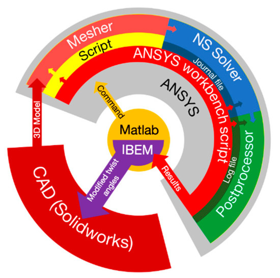 Figure 2 shows the proposed automation framework in the first approach, in which there are three major components. The first part is the CAD software. SolidWorks is one of the commonly used CAD packages for blade designs. After the design has been finalized, SolidWorks can output the 3D blade model to the mesh solver for grid generation and regeneration during the optimization of the blade geometry. The second component is the CFD package, which is the ANSYS Fluent software with modules for pre-processing including grid generation, numerical simulation, and post-processing, mainly for verifying the new design in the optimization loop. The third component is the optimization environment where MATLAB was incorporated. It was also chosen as a core component for the automating framework as it can perform data interpretation and optimization using separate scripts as well as communicating between different applications and control the sequence of operations.