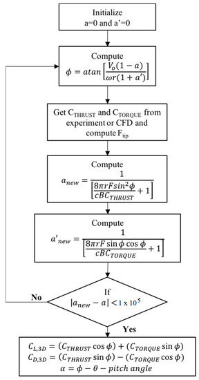 In the IBEM scheme, the blade is also divided into sections. At each section, the iterative scheme depicted in Figure 3 is used to calculate THRUST and TORQUE can be obtained from either simulation or experiment and are then used to compute , which is a correction factor that includes the hub and tip losses [24,25,26,27,28,29]. The new axial and angular induction factors are then derived and used to check for convergence. Upon convergence, the local 3D lift and drag coefficients (i.e., L,3D and D,3D, respectively) along with the angle of attack are determined for each annular element.