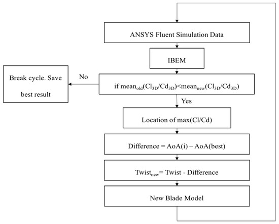 The pressure readings from CFD simulation are used to determine THRUST and TORQUE. The IBEM scheme implemented in the proposed system then uses these values to estimate the angle of attack, 3D lift, and drag coefficients at each section. These estimations are then used to find the average lift-to-drag ratio across the blade. The criterion is to maximize the average lift-to-drag ratio for the whole blade. The first step is to search for the location where the maximum lift-to-drag ratio occurs. The angle of attack at this location is used as the reference for the adjustment of the twist angles at all other sections. The magnitude of adjustment for the twist angle at every section is determined by the difference between the local and the reference angles of attack. The twist angles newly determined are then saved and transferred to the 3D parametric modeler to generate a new blade 3D model. The flow of this process is depicted in Figure 4.