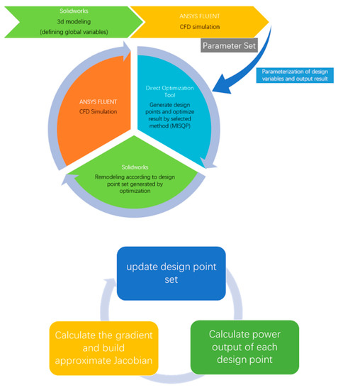 Alternatively, to utilize the stall delay is to incorporate CFD into the design process to directly analyze the complex 3D flow around the blade geometry and the interacting influence on the turbine performance. The findings can then be utilized to optimize the blade geometry by changing the angle of attack and other parameters. The main drawback of this approach is that the calculation of the wind turbine performance using CFD is a highly computing-time-consuming and labor-intensive process. In addition, multiple software packages for solid modeling, mesh regeneration, CFD analysis, data processing/transfer and optimization may need to be utilized. The iterative design optimization process needs to consider the changing blade geometry and computational mesh in the CFD model in each iteration. Repetitive operations of the above optimization process can be an issue for many designers. This approach is not only inefficient but has also limited control over the 3D shape optimization. Commercial CAD packages such as SolidWorks are more suited to 3D design modifications. The bridging of the gap between a sophisticated CAD package and a complex CFD solver is a subject of great interest. To make matter worse, the blade geometry and the CFD analysis results will have to be transferred to an optimization package after each design optimization iteration to determine the new blade geometry.