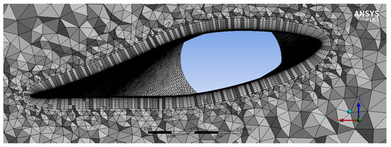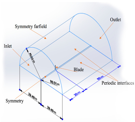 The computational domain is defined by its boundaries, within which the blade is located and would interact with the fluid. The domain developed based on a single blade is shown in Figure 5, which is in the form of a half-cylinder with a radius of 30 m and a total length of 70 m. A small cylindrical cut-off with a radius of 0.51 m is used to replace the presence of the hub. The blade is located 20 m from the inlet and 50 m before the outlet. The origin of the global coordinate system is located at the hub of the wind turbine. Since the simulation is simplified by the use of the half-cylinder domain with imposed rotation around the Z-axis, the two periodic interfaces shown in Figure 5 are used. Previous fluid dynamic studies of the NREL Phase VI wind turbine used different meshing methods and software packages. Nevertheless, it is generally accepted that structured mesh is more economical as it reduces the total number of elements compared to an unstructured one. However, the major drawback of structured meshes is that it requires a great effort to construct. For that reason, an unstructured mesh is used in this work, but the near-wall mesh is structured to improve its resolution of the turbulent boundary layers. Unstructured mesh also requires mesh refinement in the zones where complex fluid flow occurs. This includes blade surface and, to a certain extent, regions surrounding it. The ANSYS Fluent built-in meshing tool can insert face sizing and inflation layers on top of the blade surfaces. In addition, periodic boundary conditions require mesh matching in the regions where rotation will occur. This includes the two bottom faces of the fluid domain shown in Figure 8. The resulting hybrid unstructured/structured mesh is shown in Figure 9. When applying inflation layers, it is important to have a sufficiently small first-layer thickness in order to resolve the laminar sublayers under the generally turbulent boundary layers along the blade surfaces. A thickness of 0.00001 m is used to maintain the Y+ value below 1. This will help to capture any turbulent boundary layer and its separation from the wall accurately.