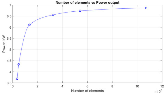 The mesh convergence study was performed by both approaches. The results of 3D RANS simulation are shown in Figure 12. The mesh refinements have dramatically diminished the change of the power output after 6 million elements were used. Approximately 10 million elements were chosen to be used for this study for extra accuracy of the calculation of the boundary layers and drag force since the drag coefficient was used in the optimization process. One simulation with the given number of elements took approximately 17 h to calculate on the 16-core workstation, with 128 GB of RAM.