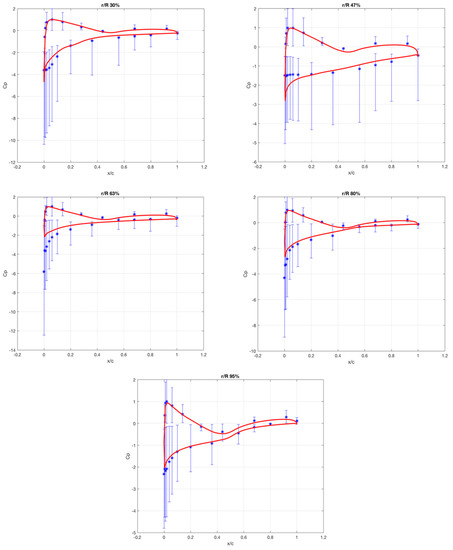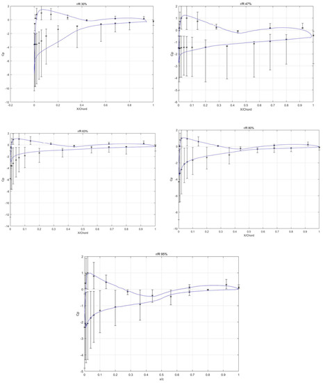 The numerical analysis was performed on the model at different wind speeds and the pressures obtained were converted to pressure coefficients. The pressure coefficients distributions in different sections are compared with the experimental measurements obtained from the NREL Phase VI experiments. Figure 13 shows the comparison of pressure coefficient distributions at a wind speed of 10 m/s. To account for measurement variations, error bar plots are used. The mean values are highlighted by the “*” sign and variation bars display the upper and lower thresholds values. Red curves represent the results obtained from CFD simulation and the blue stars with bars the actual measurements of NREL tests. Generally, the simulation results are within the range of possible values measured in the experiments. It is noted that discrepancies are especially pronounced close to the leading edge on the suction side of the blade and most notable at the 47 and 63% span stations. Results at other values of wind speed are relatively similar.