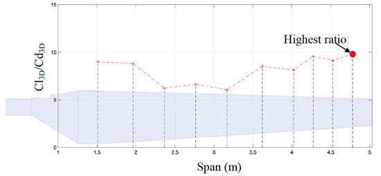 In the first approach, the CFD model developed for the NREL Phase VI rotor blade is then employed to validate the proposed optimization framework. The wind speed is set at the designed condition of 10 m/s. Figure 15 shows the distribution of the original blade 3D lift-to-drag coefficient ratio. The highest ratio is located towards the end of the blade, at the last span-wise section. This point is indicated as the highest ratio in Figure 15. This location is the reference point from which the difference between angles of attack will be calculated in the IBEM optimization scheme. The reference point is also shown in Figure 16 for the angle of attack distribution of the original blade. The mean 3D lift-to-drag coefficient ratio across the blade is 8.188.