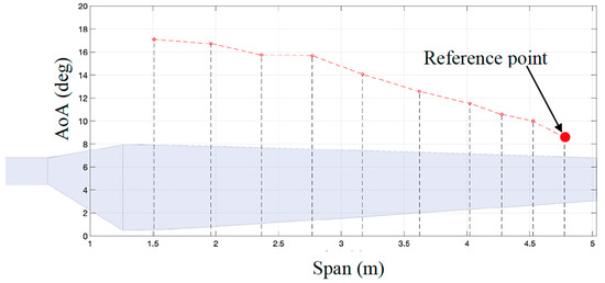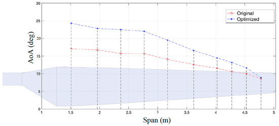 The resulting twist angle distributions produced by the aforementioned procedure are presented in Figure 24. It also shows the optimized twist angle distribution based on the original method from Figure 20. The three configurations were simulated using the proposed framework and the calculated AOA are presented in the Figure 25. As can be observed, the AOA follow the prescribed changes. In two regions the AOA becomes higher and in one it remains approximately the same.