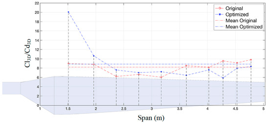 Cl3D/Cd3D ratio distributions for the original and optimized blades at 10 m/s.