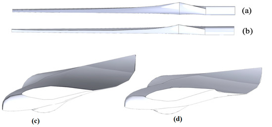 Side view of the (a) original and (b) optimized blade (top); End view of the (c) original and (d) optimized (bottom).
