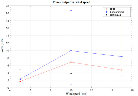 Power output comparison of the original design (experimental data), CFD simulation, and optimized blade.