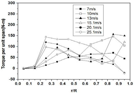 Based on the data by MO and Lee (as shown in Figure 22) [28], we can find out what region and what wind speed produce the highest torque. From the root until approximately 60% of the span, the highest torque is produced at 25 m/s; from 60% to 85% of span, the largest torque is generated at 10 m/s and from this point till the tip, the highest torque is produced at 13 m/s. This gives an insight into how to change the twist angle in order to produce a blade that has high torque throughout its span. In order to generate such local twist angles. we need to have the angle of attack data at these speeds. Figure 23 shows the angle of attack (AOA) distributions for multiple values of wind speed. The ones that we are interested in are 25, 10, and 13 m/s. We can deduce the desired twist angles using the formulation presented in Figure 3.