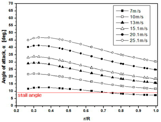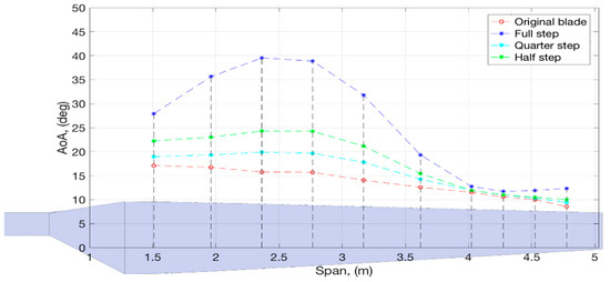 Angle of attack distribution for different blade configurations.