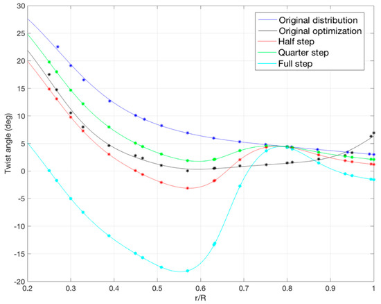 Twist angle distribution for different blade configurations.