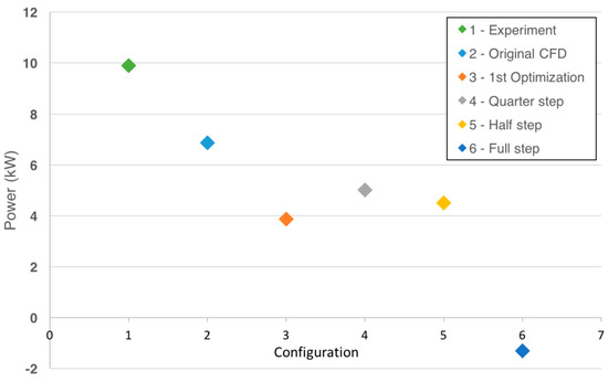 In the second approach (4D URANS), the whole rotor model uses 19.8 million elements. Additionally, the 4D URANS simulation took 3.5 h on a 44-core workstation with 516 GB of RAM. The power output of the original design is 8799.24 W which is closer to the experimental data compared to the result of the first approach, as shown in Figure 14.