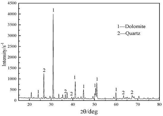 The test core samples were taken from an undisclosed location in Yunnan province, China. The particle size distribution of the undressed ore mineral was not uniform, and it largely showed a block, conglomeratic, and plate-type distribution. The XRD spectrum of the undressed ore is shown in Figure 1. It can be seen from Figure 1 that the original mineral belonged to high-alkaline minerals. The gangue was mainly composed of dolomite and quartz. The copper-containing minerals mainly consisted of malachite and chalcopyrite. The copper phase analysis results are presented in Table 1. It can be seen from Table 1 that the total copper content, oxidation rate, and combination rate were 0.47%, 50.66%, and 12.34%, respectively. These values showed that the oxidation rate was higher; this belonged to low-grade copper ore, which is difficult to oxidize. Based upon these values, it can be said that the sulfide flotation method can be used to effectively recycle copper mineral resources.