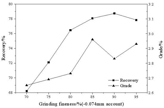 First, under different grinding conditions, the minerals were examined for changes in flotation concentrate and recovery of copper grade. The ground particles finer than 0.074 mm accounted for 70%, 75%, 80%, 85%, 90%, and 95% of the total ground sample respectively. Under the conditions of a fixed collecting agent dosage of 600 g/t, vulcanizing agent dosage of 1000 g/t, and foaming agent dosage of 100 g/t, the experiments were carried out. The obtained results are shown in Figure 3.